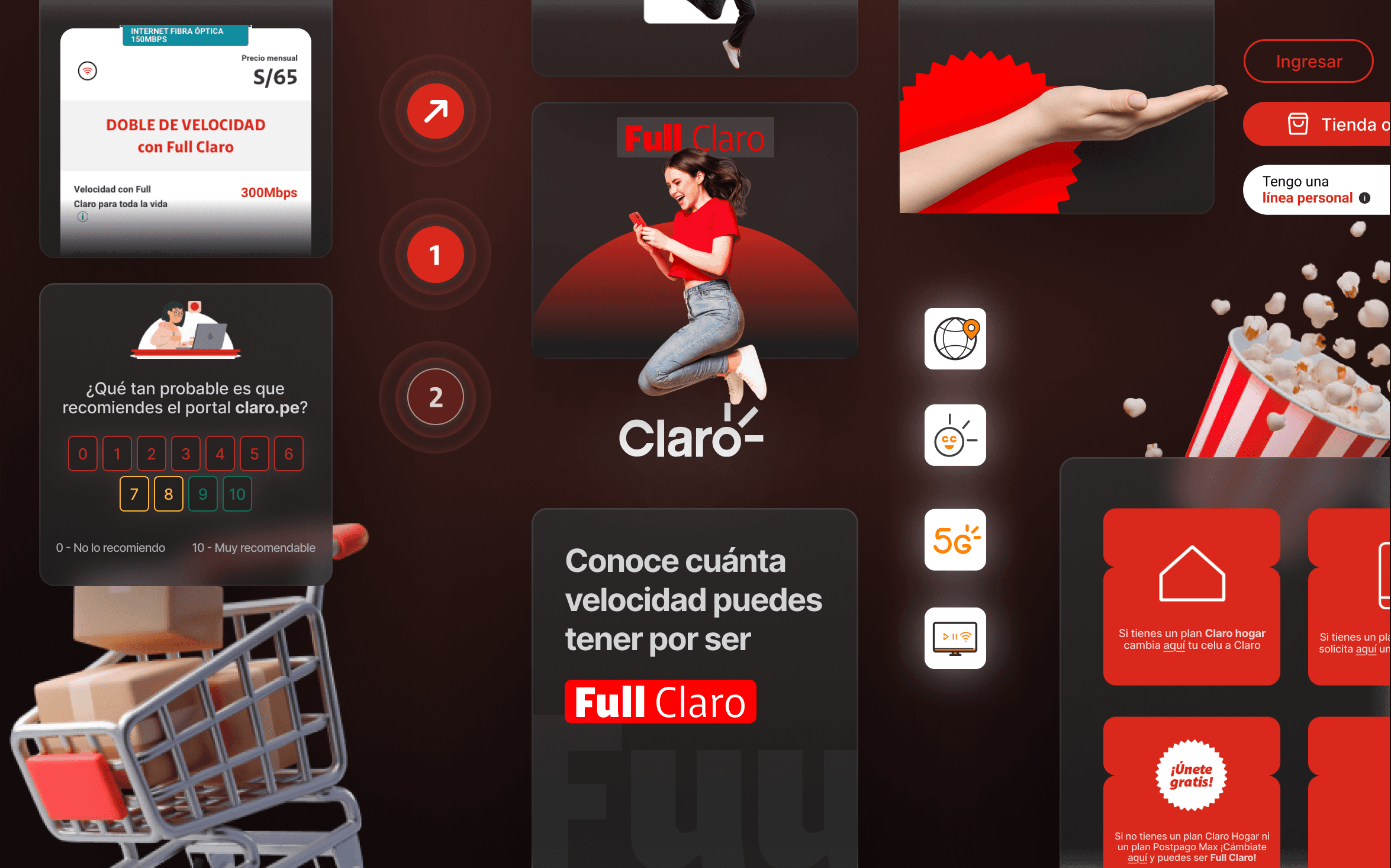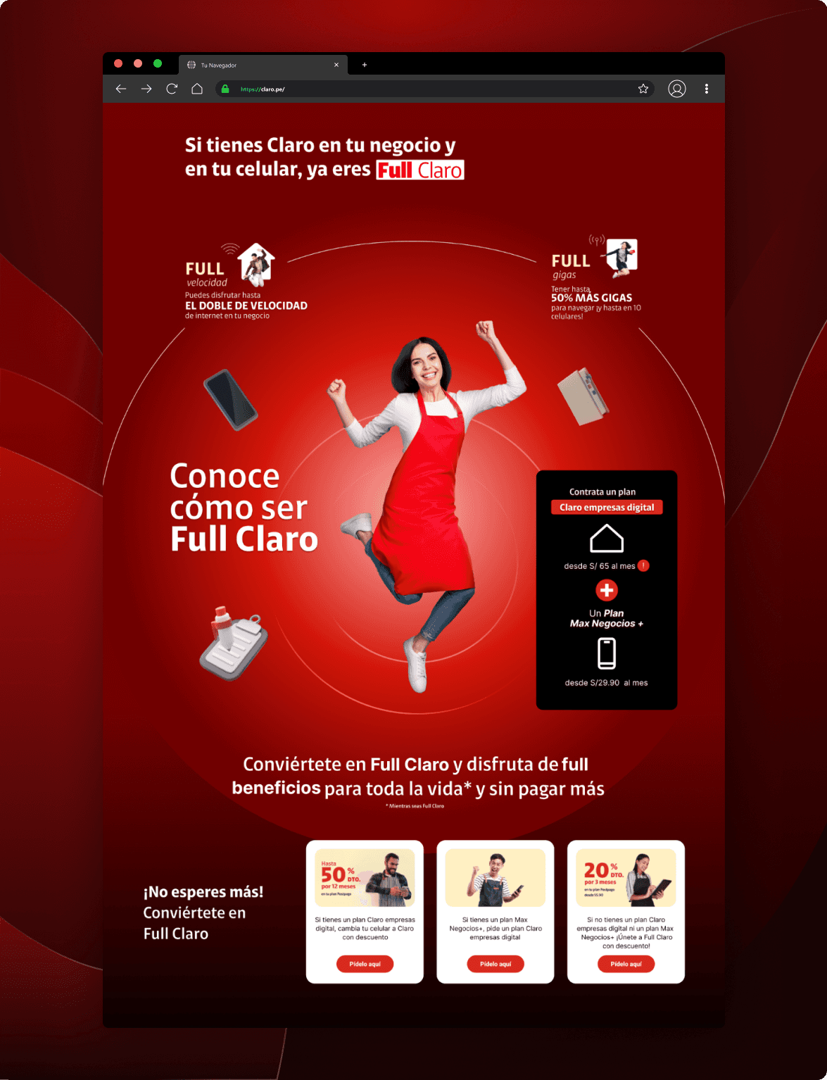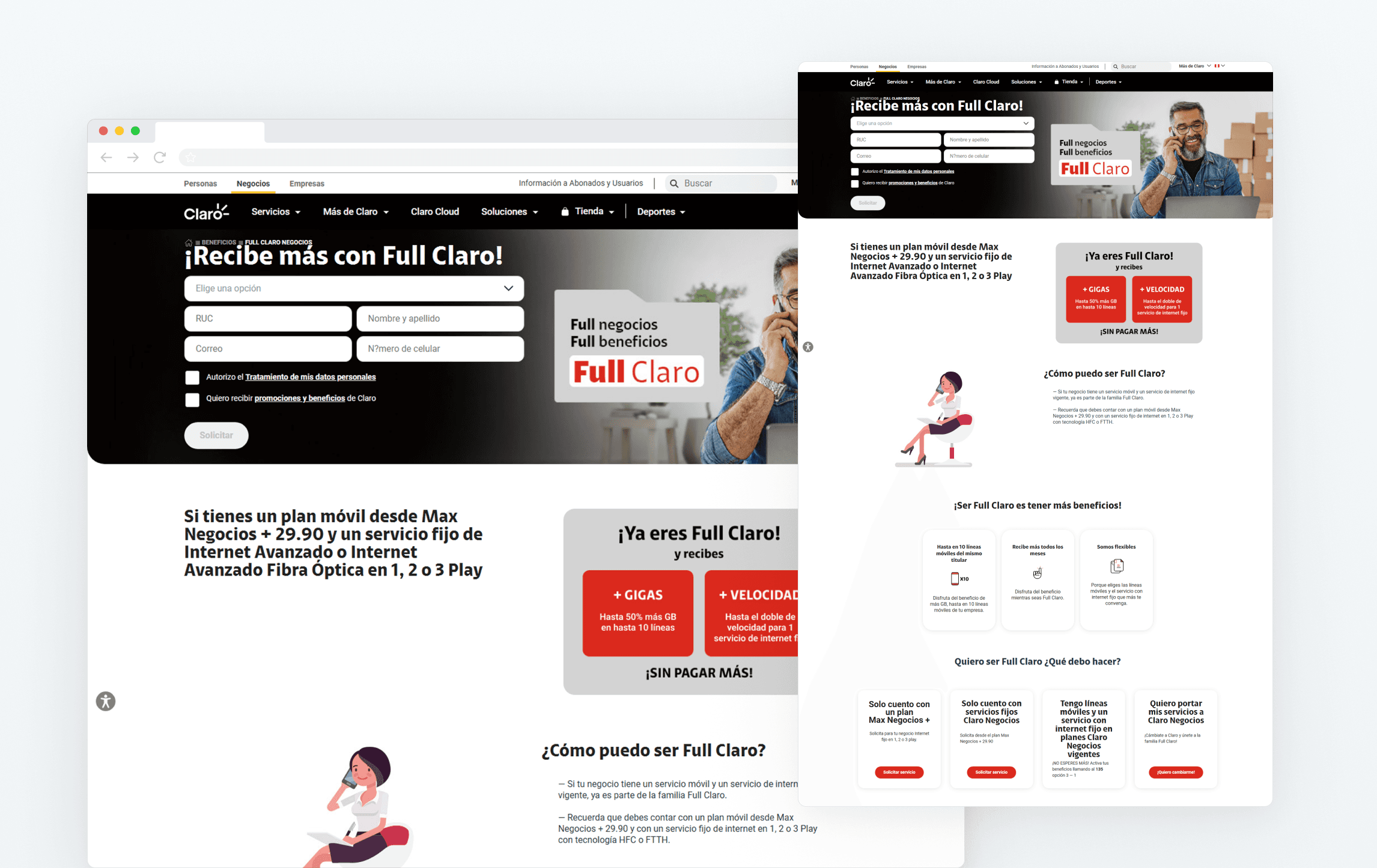 El rediseño de la landing de Claro Negocios partió de bases ya existente: piezas gráficas desarrolladas previamente para explicar la propuesta Full Claro en sus canales digitales (Figura 2.0)